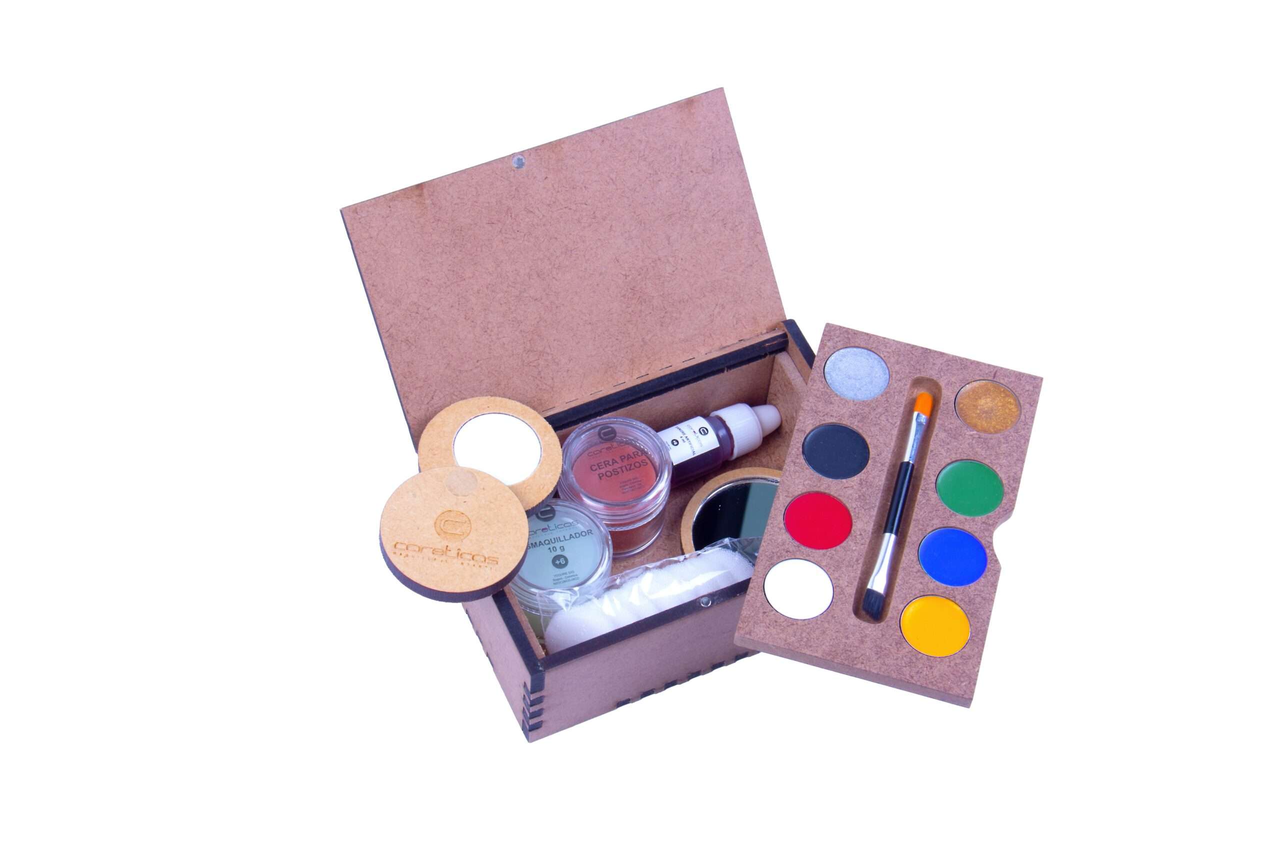 Kit para niños de más de 7 años que contiene 8 bases color , polvo compacto, cera para postizos, sangre artificial, desmaquillador, esponjas, espátula y pincel de doble función.